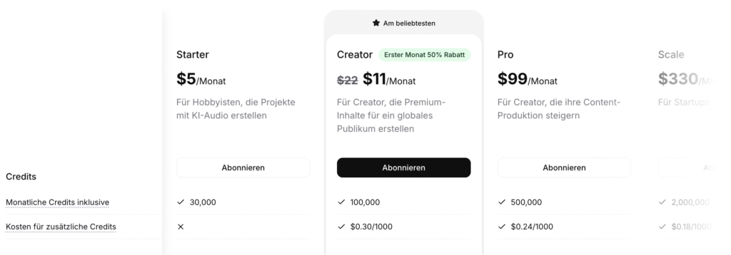 Meine Einschätzung: Für reine Musik-Generierung wirkt der Preis erstmal happig. Aber: Als Teil des ElevenLabs-Universums mit Voice-AI und Co. wird das Paket attraktiver. Besonders wenn du bereits deren Services nutzt, ist das ein ganzer Audio-Kreativ-Baukasten.